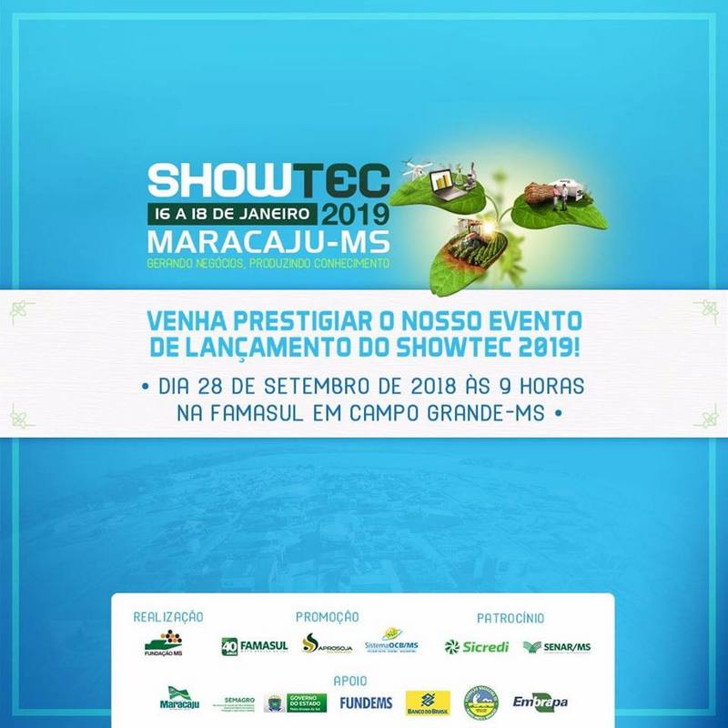 Será lançado nesta sexta-feira (28) o Showtec 2019, às 9h, na sede do Sistema Famasul, em Campo Grande. Serão apresentadas as novidades da feira, que é considerada uma das maiores do segmento de agricultura e pecuária do Brasil. O evento está marcado para os dias 16, 17 e 18 de janeiro do próximo ano, em Maracaju (MS) e conta com mais de 100 expositores, mostras de tecnologias, maquinários agrícolas, painéis e espaços para realização de negócios.